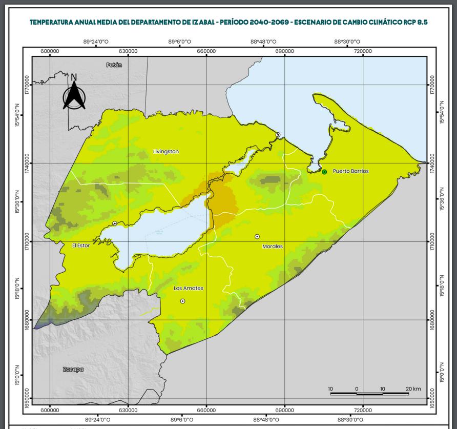 Según el Atlas de vulnerabilidad al cambio climático del departamento de Izabal publicado por el Ministerio de Ambiente y Recursos Naturales (MARN) y Rain Forest en 2022, a nivel general el departamento de Izabal presenta una temperatura media de 25.7°C, con máximas de 34.3°C, y mínimas de 17.7°C.