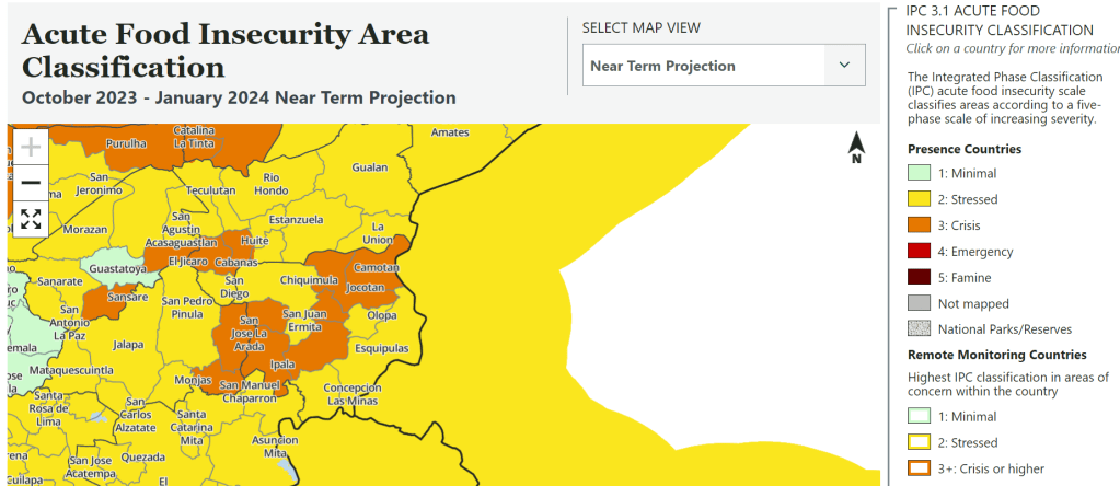 «Pero no solo la situación general del país es preocupante. Según FEWS NET, existen territorios en Guatemala con seguridad alimentaria en situación más grave que únicamente «estrés». Algunos lugares situados en el oriente del país, como el departamento de Chiquimula, se encuentran en «situación de crisis» (en color anaranjado en el mapa).