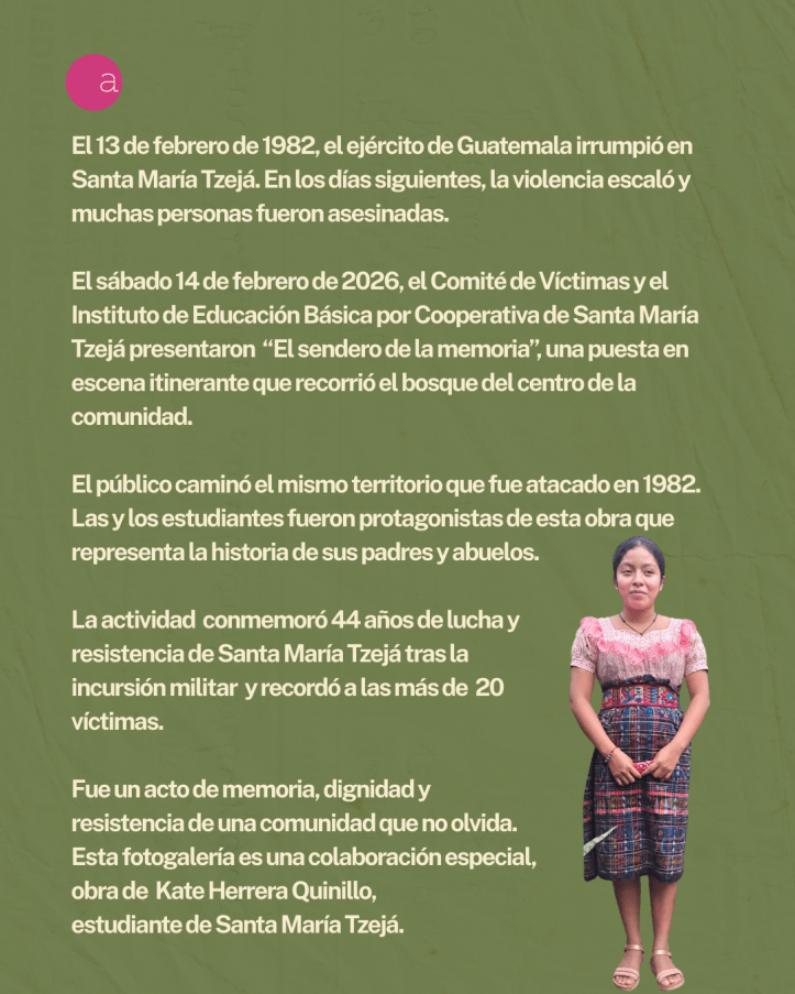 Cuarenta y cuatro años después, el 14 de febrero de 2026, la comunidad volvió a reunirse en ese mismo territorio. El Comité de Víctimas y el Instituto de Educación Básica por Cooperativa de Santa María Tzejá presentaron la obra itinerante “El sendero de la memoria”.